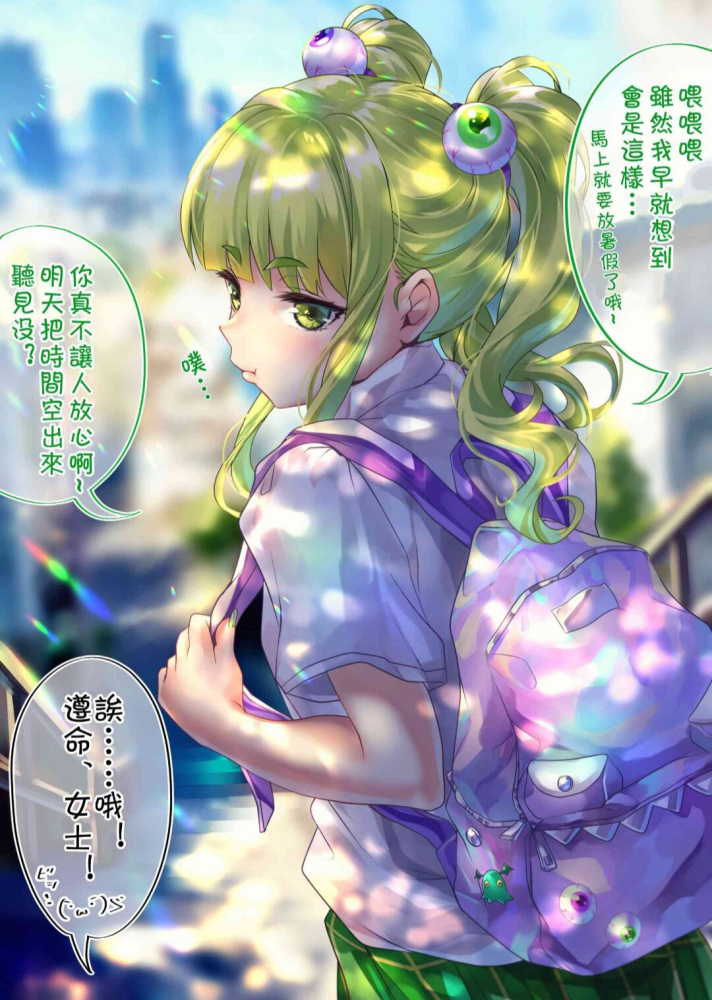 绿发少女露出很灿烂的笑容,尖尖的牙齿在教室的灯光下冒着锐利的光芒,像个小鲨鱼一样。